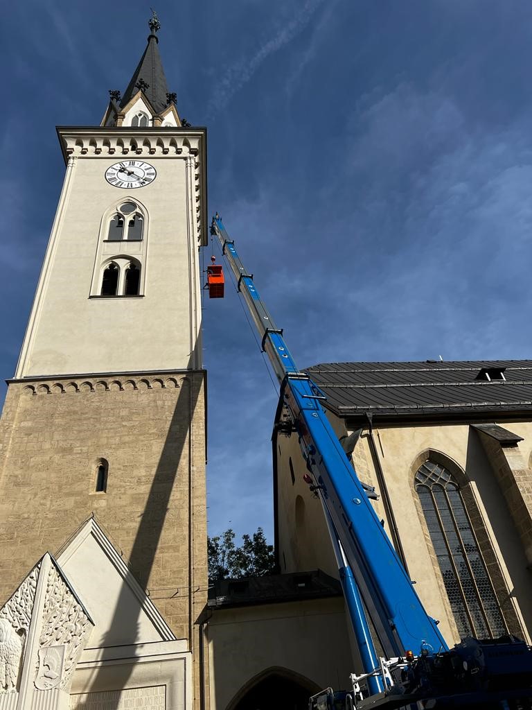 Das ETK - Team ist wieder mit vollem Einsatz bei der Montage der Weihnachtsbeleuchtung am Kirchturm der Stadt Villach.