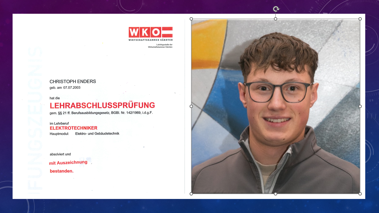 Wir gratulieren unseren Lehrling Christoph zur bestandenen LEHRABSCHLUSSPRÜFUNG mit "AUSZEICHNUNG" im Lehrberuf ELEKTROTECHNIKER.