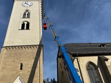 Das ETK - Team ist wieder mit vollem Einsatz bei der Montage der Weihnachtsbeleuchtung am Kirchturm der Stadt Villach.